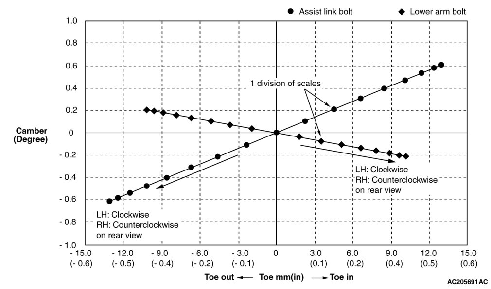 - If either the camber or toe is adjusted, both should fluctuate. For the relationship between the two, refer to CAMBER AND TOE REFERENCE TABLE (Refer to ).