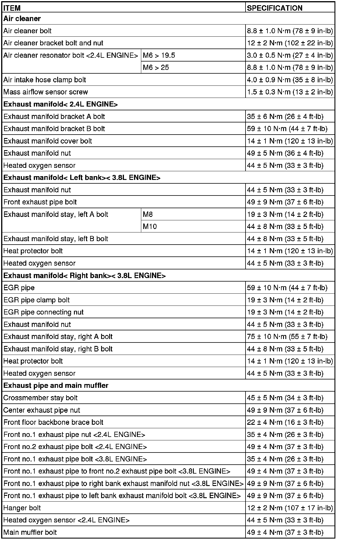 FASTENER TIGHTENING SPECIFICATIONS