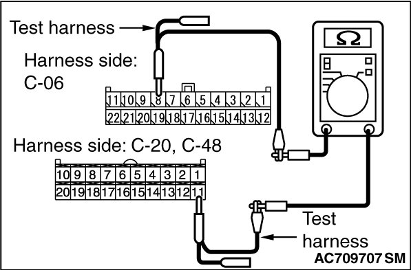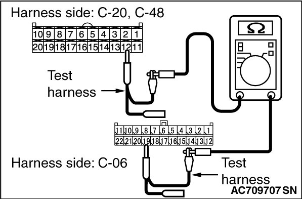 (3)Check the wiring harness between joint connector (CAN1) C-06 (terminal 19) and A/C-ECU connector C-20 or heater control unit connector C-48 [vehicles without A/C] (terminal 12)