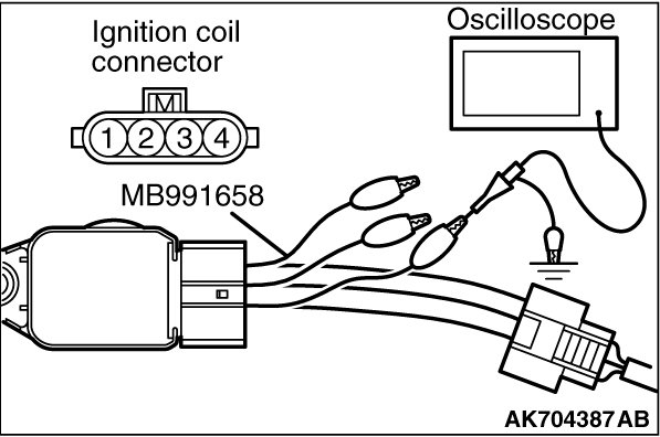 1. Disconnect the ignition coil connector, and connect test harness special tool (MB991658) between the separated connector. (All terminals should be connected.)
