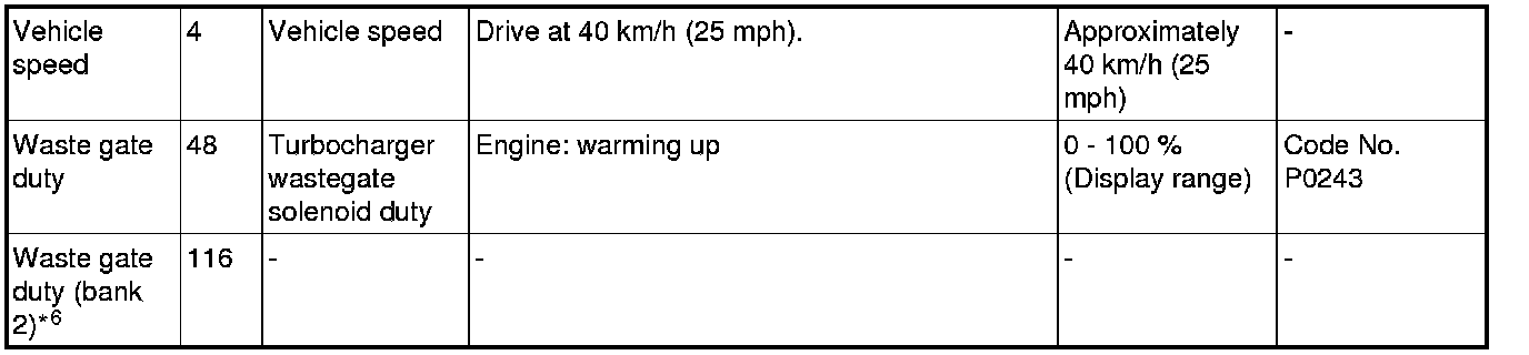 *6: Data item is displayed on scan tool display, but the turbocharger wastegate solenoid 2 is not equipped and its data is displayed as "0 %".