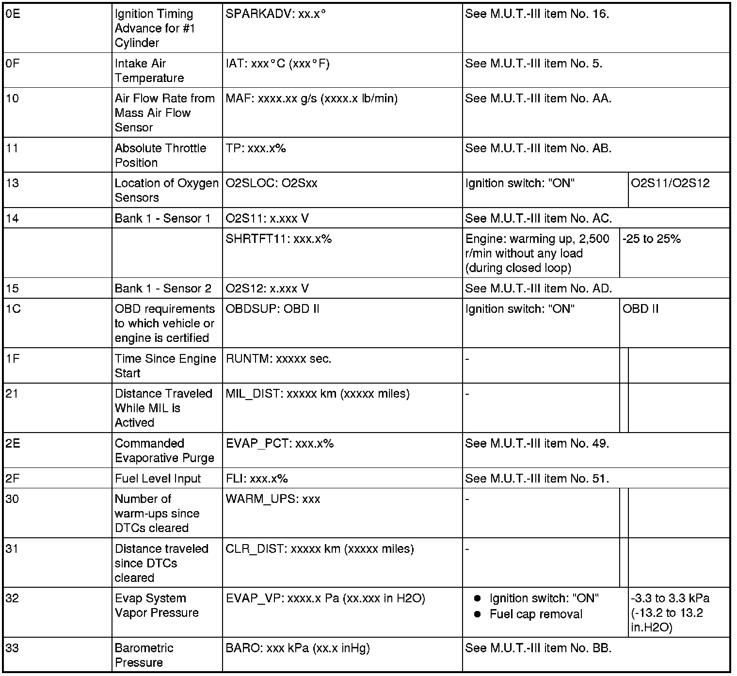 General Scan Tool (GST) Mode 01 Reference Table