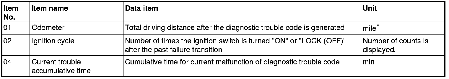 When detecting fault and storing the DTC, the ECU connected to CAN bus line obtains the data before the determination of the DTC and the data when the DTC is determined, and then stores the ECU status of that time. By analyzing the data from scan tool, the troubleshooting can be performed more efficiently. The displayed items are as shown in the table below.