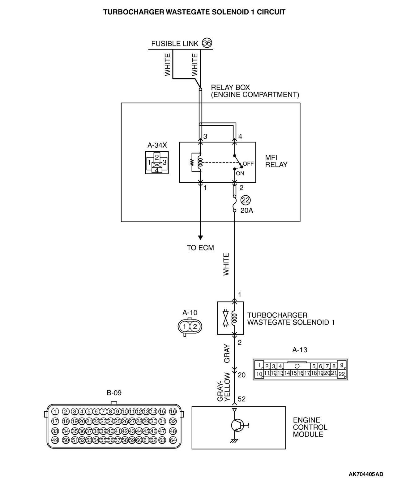 - The turbocharger wastegate solenoid 1 power is supplied from the MFI relay (terminal No. 2).