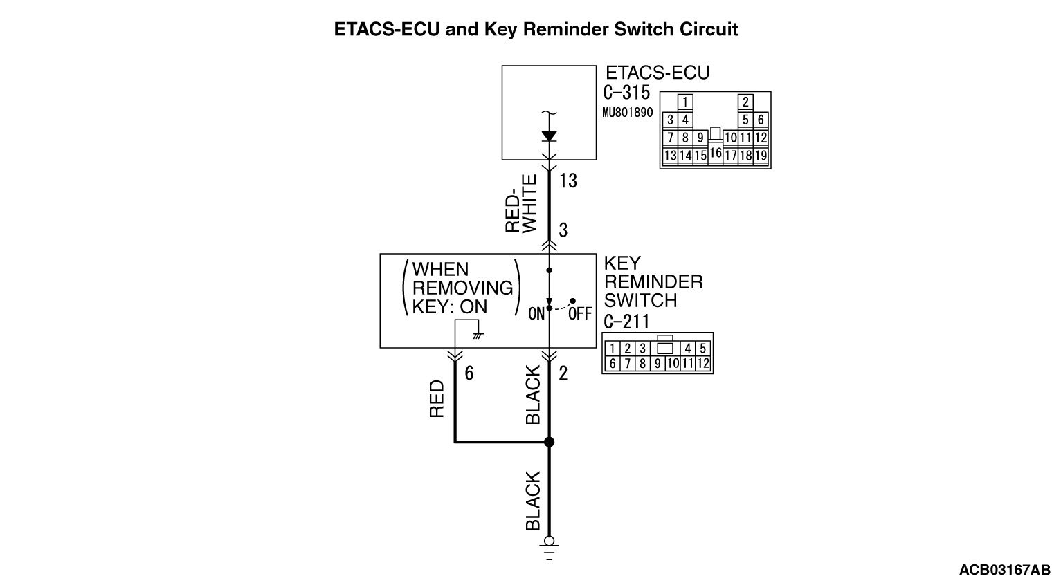 NO Check the C-211 key reminder switch connector, the C-315 ETACS-ECU connector, the wiring harness between the C-211 key reminder switch connector (terminal No. 3) and the C-315 ETACS-ECU connector (terminal No. 13), and between the C-211 key reminder switch connector