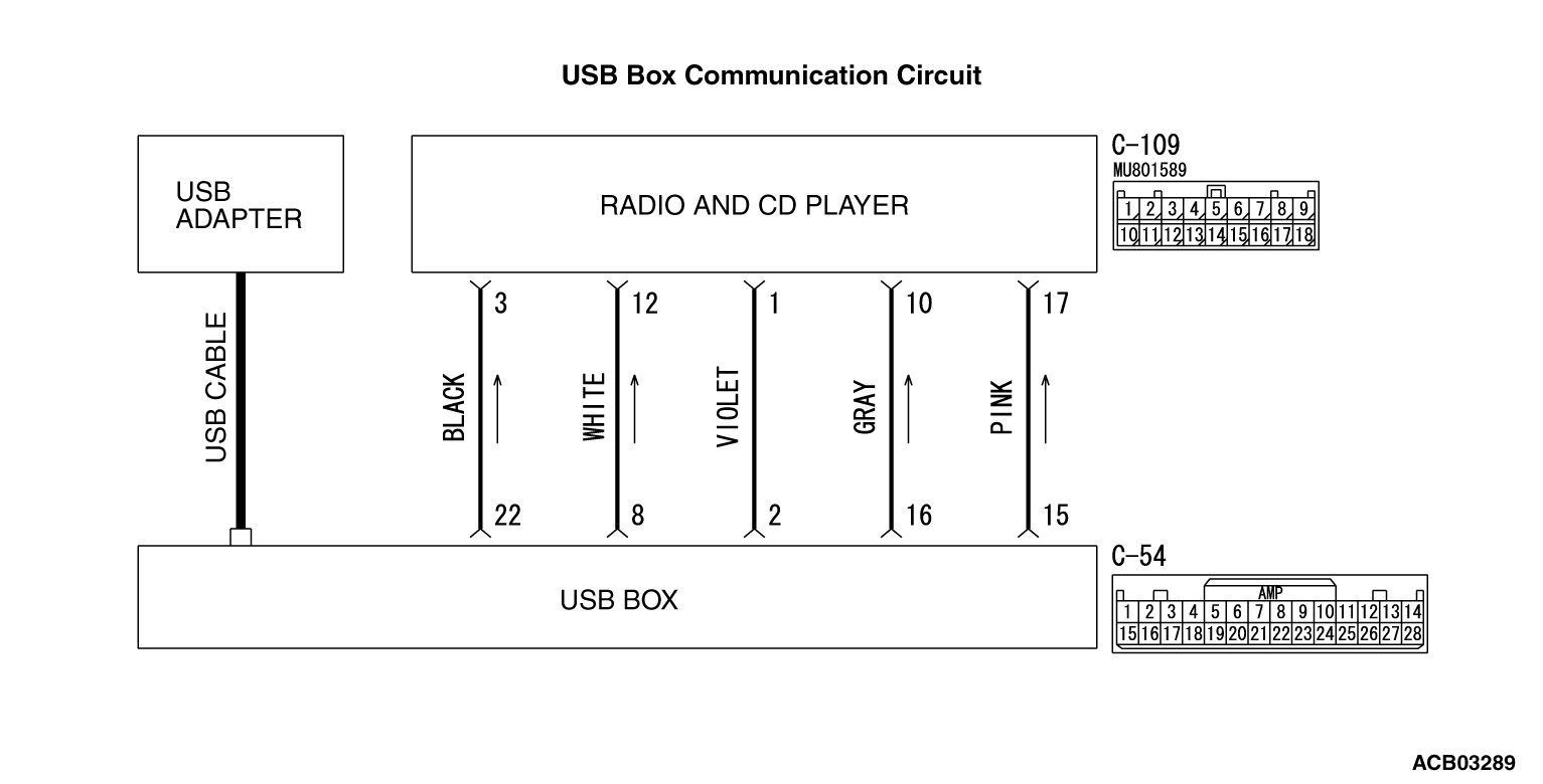 STEP 12. Check the wiring harness between radio and CD player connector C-109 (terminal 17, 12, 3, 10, 1) and USB box connector C-54 (terminal 15, 8, 22, 16, 2).