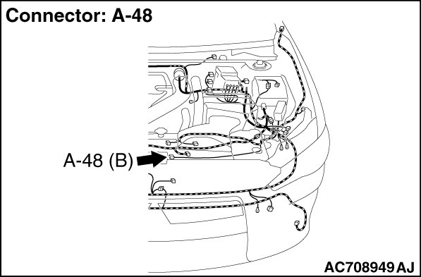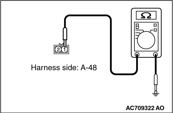 (1)Disconnect hood switch connector A-48 and measure the resistance available at the wiring harness side of the connector.