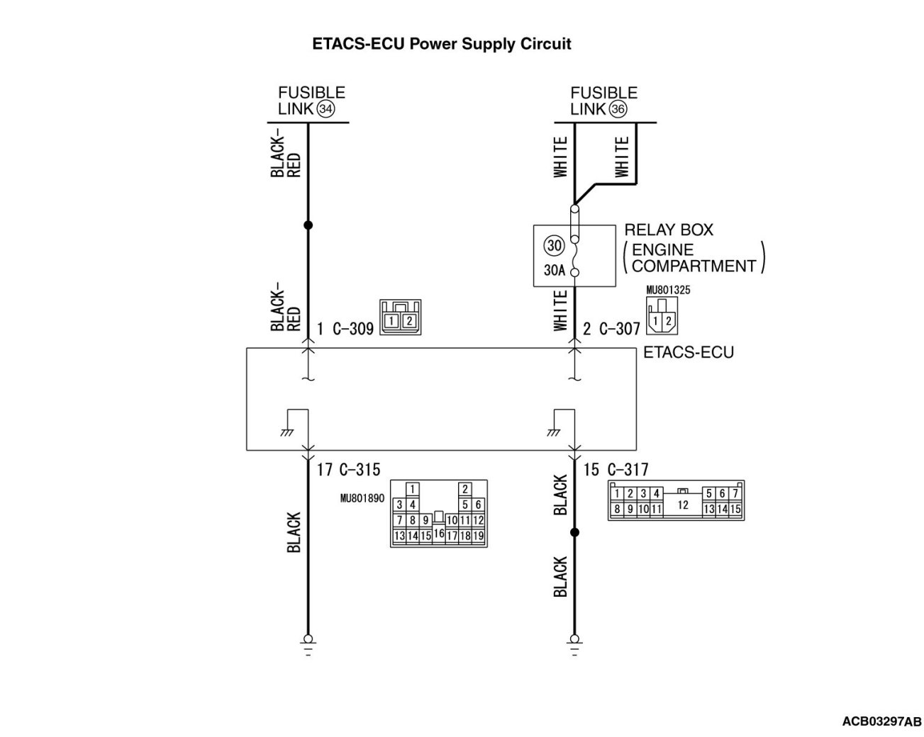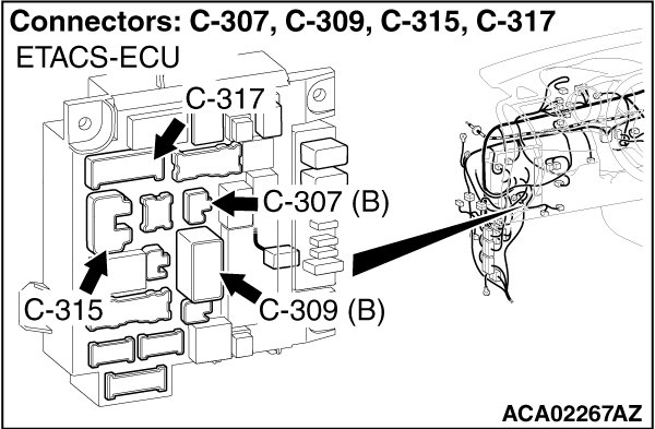 (1)Disconnect ETACS-ECU connectors C-307 and C-309 measure the voltage available at the wiring harness side of the connector.