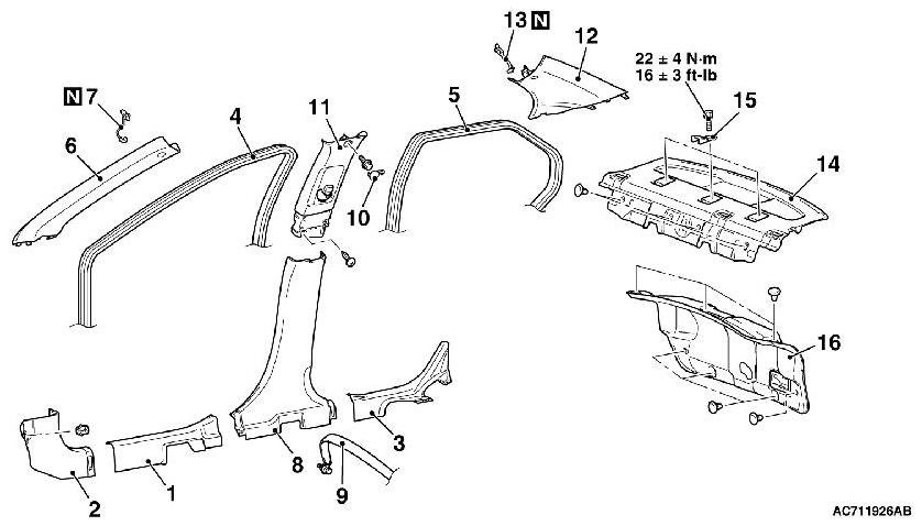 Remove the opening trim. Remove the center pillar trim upper cap by inserting the special tool MB990784 between the center pillar trim upper and body as shown in the illustration.
