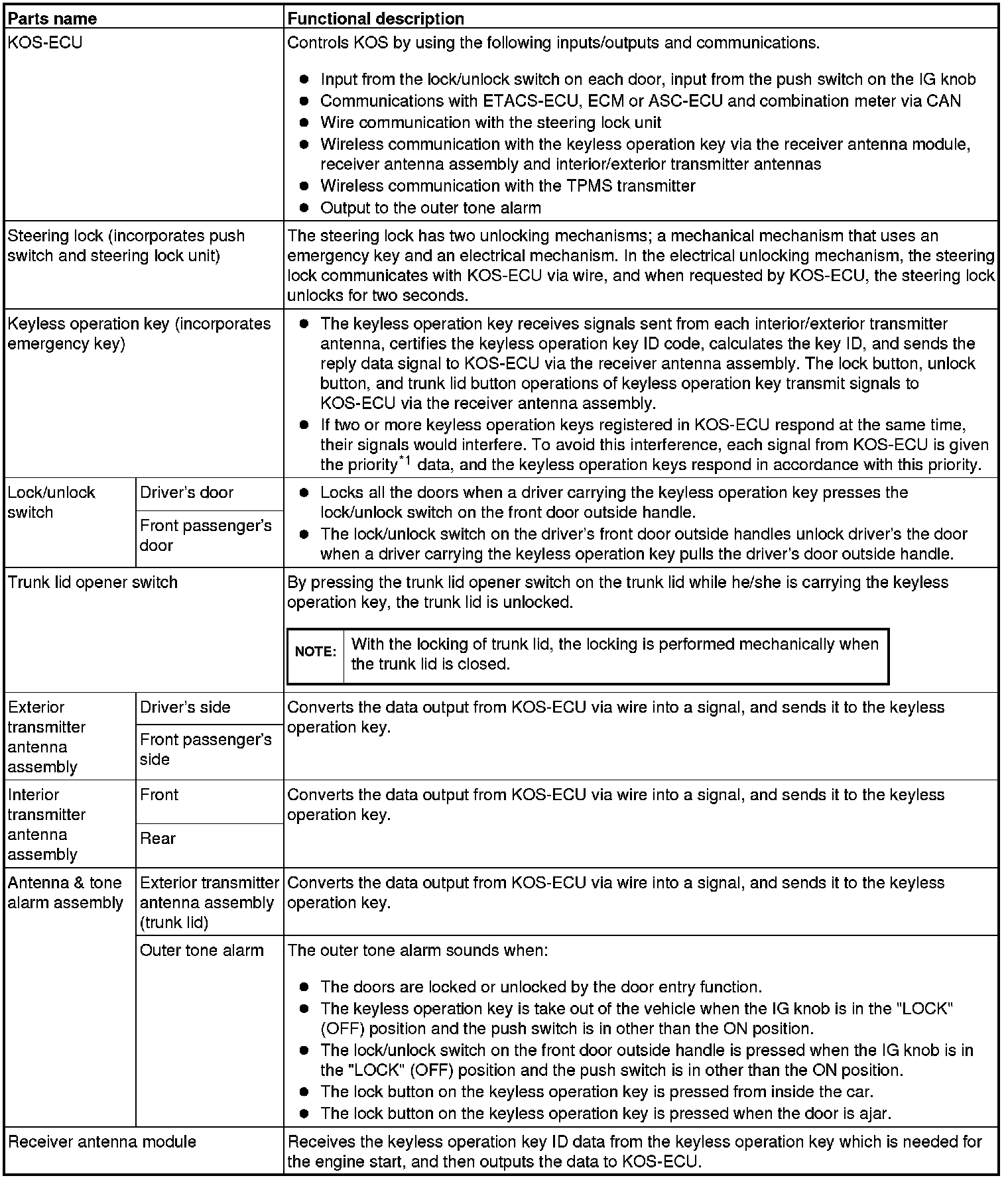 *1: When registering the keyless operation keys, KOS-ECU numbers each key (1 to 4) in the order they are registered (initial priority). This priority is renewed each time the doors are locked/unlocked and the IG knob is pressed. For example, when only keys 1 and 3 have responded to the signal sent from KOS-ECU, the new priority of the keys would be 1-3-2-4. When keys 3 and 4 have responded, then the priority of the keys becomes 3-4-1-2.