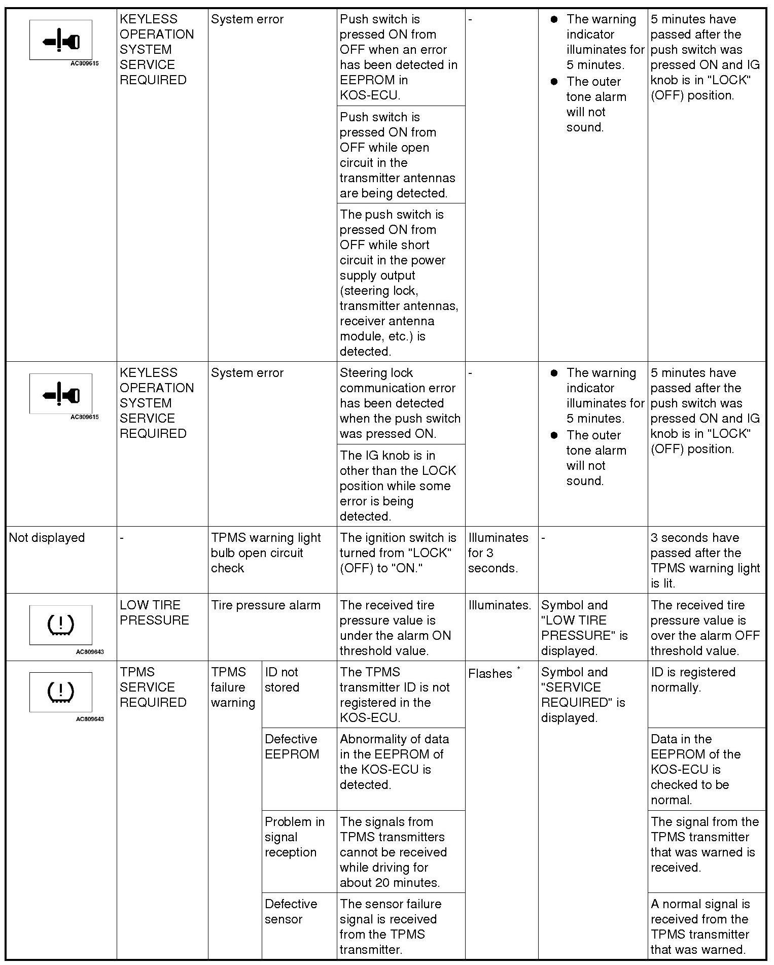 If the KOS failed, operated improperly, KOS-ECU warns the driver of this by setting off the outer tone alarm and the keyless operation warning indicator, on the multi information display in the combination meter. If the TPMS fails or the tire pressure is low, KOS-ECU warns the driver of that state by the TPMS warning light and the multi information display in the combination meter.