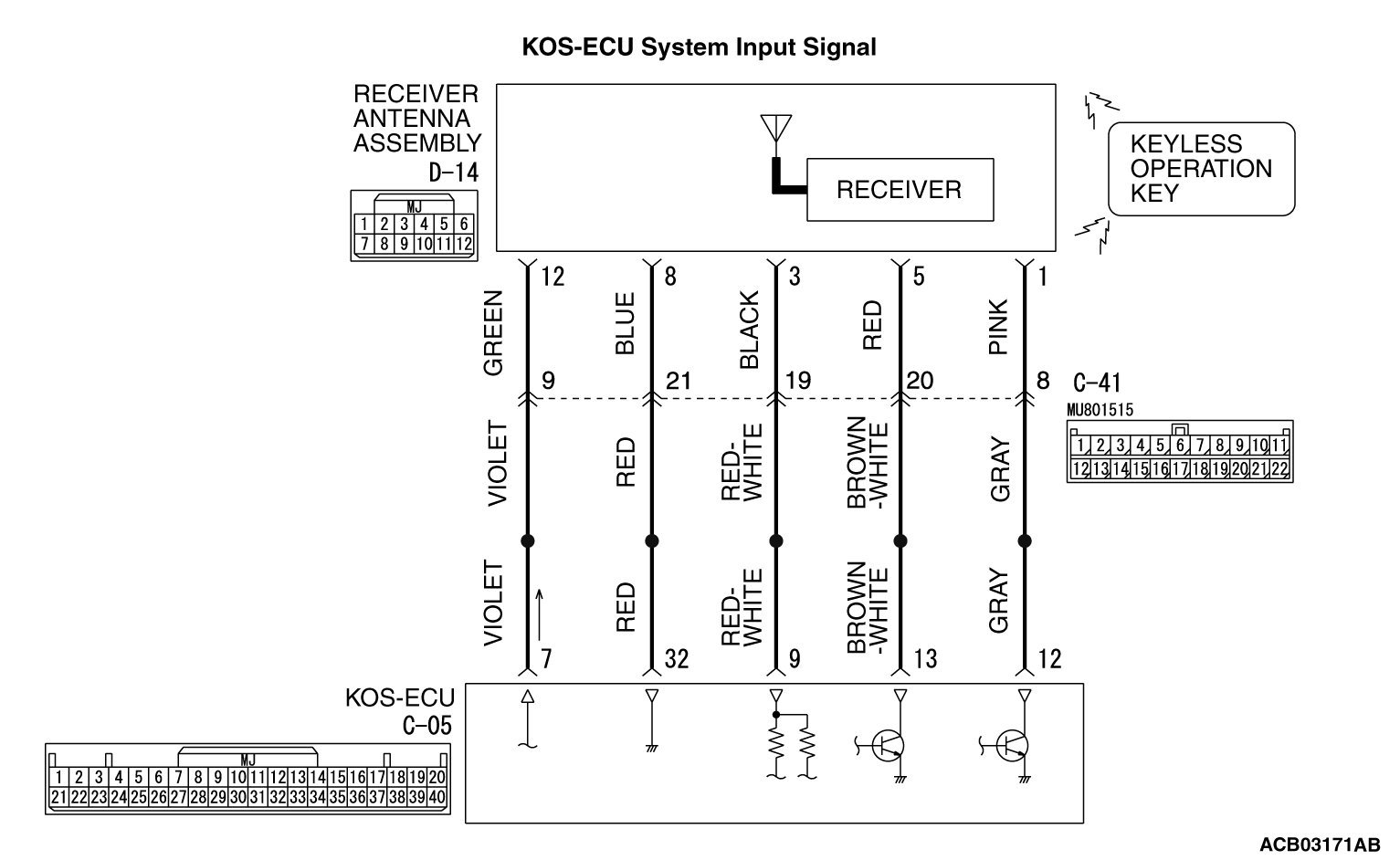 The receiver antenna module assembly lock and unlock signals from the keyless operation key, and sends them to KOS-ECU, and further to ETACS-ECU. Also, when ETACS receives signals from the key reminder switch and all the door switches, ETACS-ECU judges them to activate the keyless entry system.