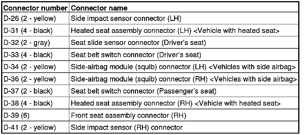 When disconnecting the side air bag module connectors of D-34 and D-36, unlock the connector by sliding the locking button to the direction of the arrow as shown in the figure, and then disconnect the connector.
