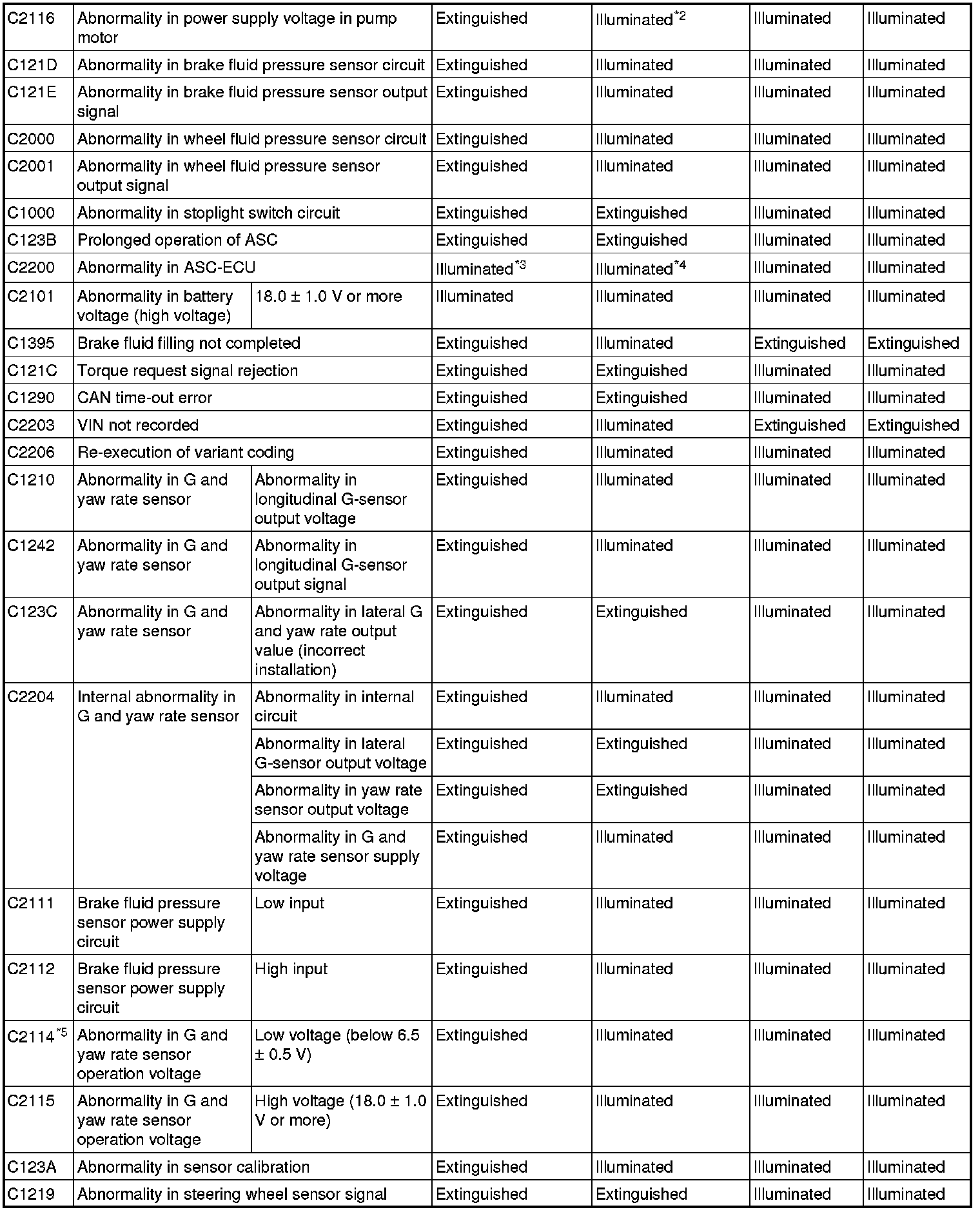 When a malfunction is determined by the diagnostic function, ASC-ECU illuminates the ABS warning light, ABS warning display, brake warning display, brake warning light *, ASC warning display, ASC warning light, and ASC OFF display. At the same time, ASC-ECU prohibits the ABS, EBD, stability control, and TCL control.