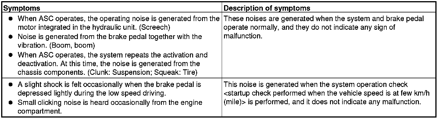 1. ASC controls the brake pressure by the assistance of ECU. The symptoms described in the table below may occur during the normal ASC operation. However, they do not indicate any sign of malfunction.