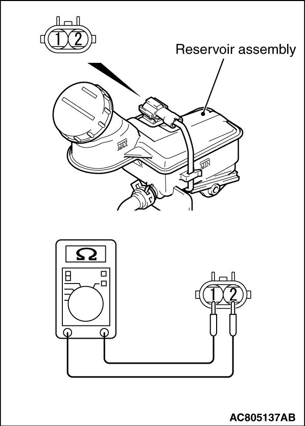 The brake fluid level switch is normal when the following conditions are met: When the brake fluid level is above "MIN," continuity is detected; and when the level is below "MIN," no continuity is detected.