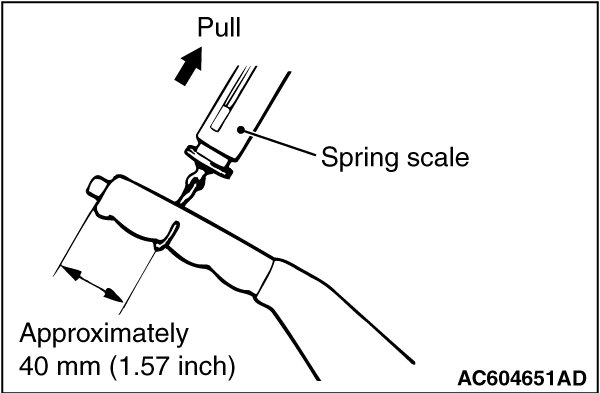 2. Set a spring scale to the center of the parking brake lever grip. Then, pull the parking brake lever to the vertical direction of the lever with a force of approximately 100 N (22 pounds).