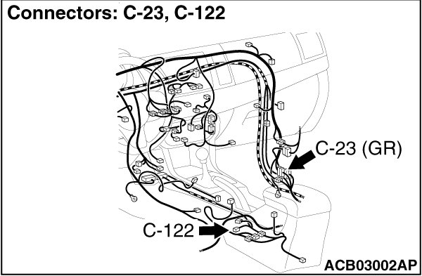STEP 3. Connector check: C-122 parking brake switch connector, C-23 intermediate connector and C-04 combination meter connector