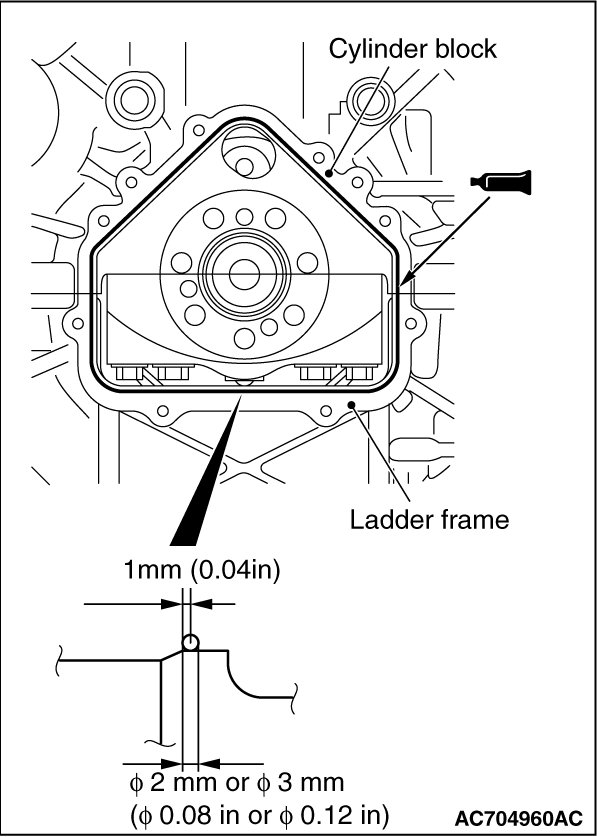2. Apply the sealant without any gap to the cylinder block and ladder frame as shown in the figure, and install the crankshaft rear oil seal case assembly.