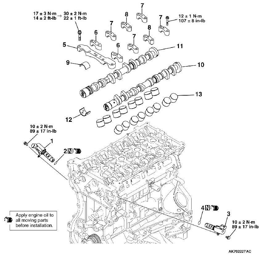 8. Tighten each front camshaft bearing cap mounting bolt to the specified torque in the order shown (2).