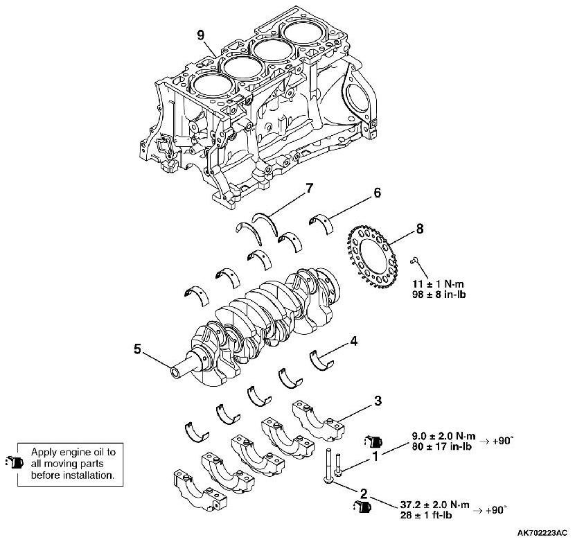 4. Tighten crankshaft bearing cap bolts to the specified torque according to the tightening order.