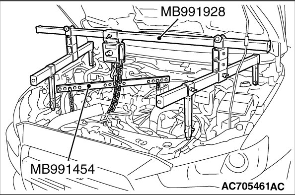 (3) Mount special tool MB991454 to the power steering oil pump bracket and the engine hanger, and set it to special tool MB991928 to support the engine and transaxle assembly.