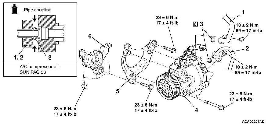 3. Tighten A/C compressor and clutch assembly mounting bolts to the specified torque in the order of number shown in the figure.