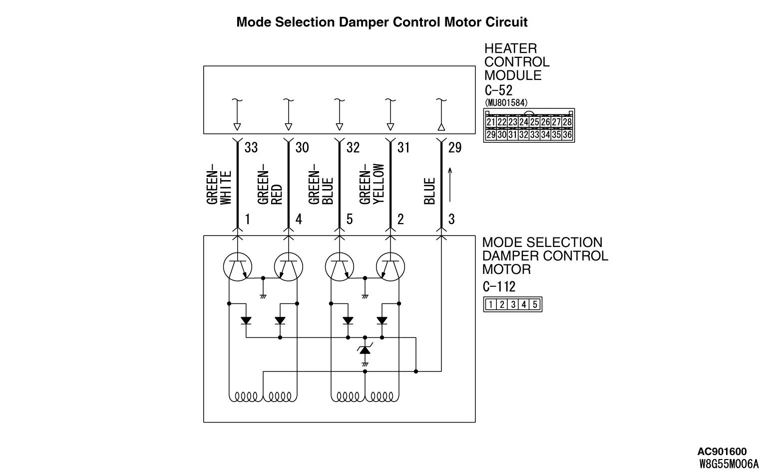 Q. Are mode selection damper control motor connector C-112 and heater control module connector C-52 in good condition?
