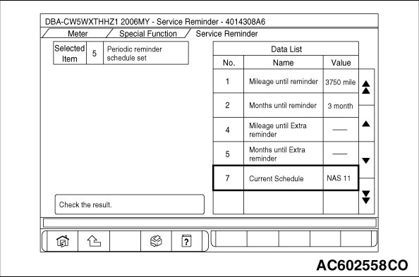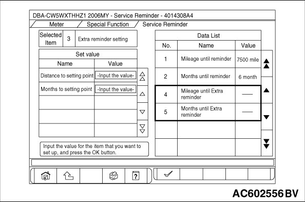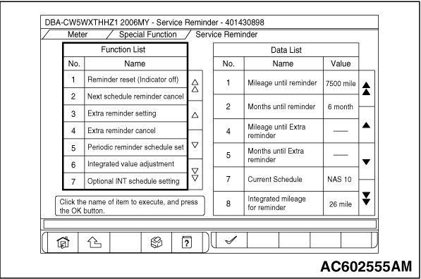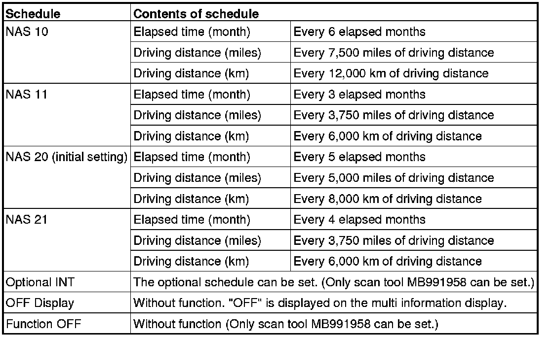 Using the scan tool MB991958, the following service reminder functions can be set. Before setting, check the current status (schedule, driving distance and elapsed days).
