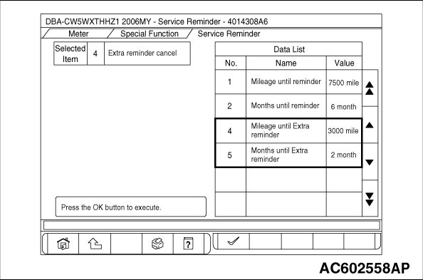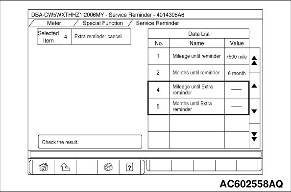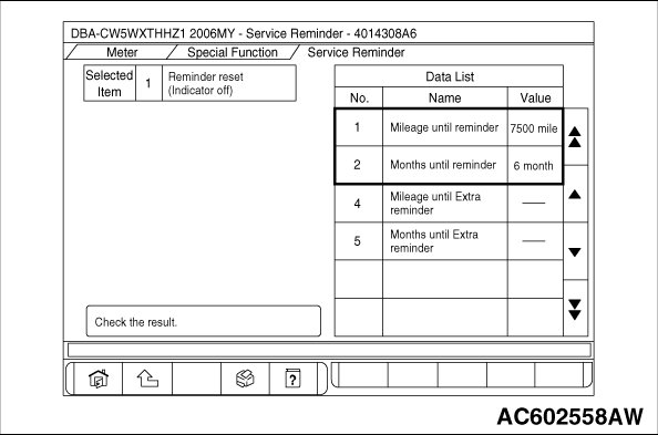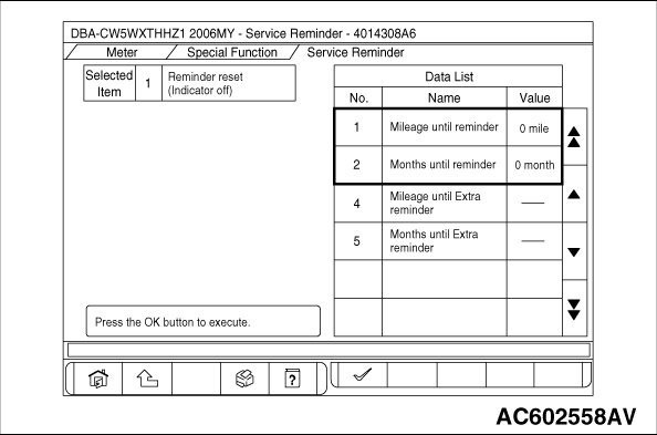 - Be careful not to execute "1 Reminder reset (Indicator off)" again after erasing the service reminder warning indicator which is currently output, because the next warning period will be cancelled.