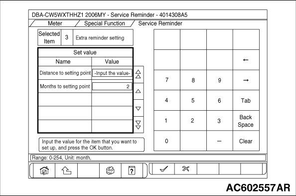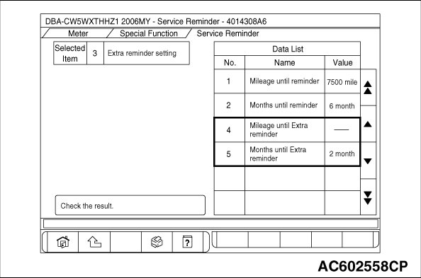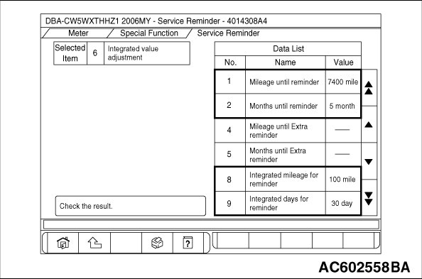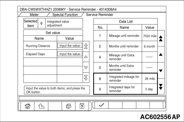 - If the combination meter needs to be replaced, the current driving distance and elapsed days must be entered into the meter after the replacement in order to be used for service reminder function. Therefore, read "Integrated mileage for reminder," "Integrated days for reminder," "Mileage until Extra reminder," "Months until Extra reminder," and "Current schedule" from the meter before the replacement using the special function of the scan tool MB991958, and note them. If "Integrated mileage for reminder" or "Integrated days for reminder" cannot be read from the meter using the scan tool MB991958, use the following method.