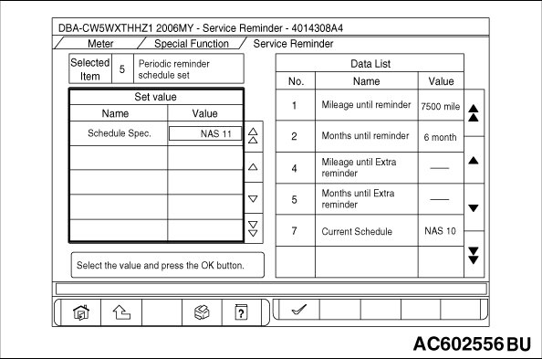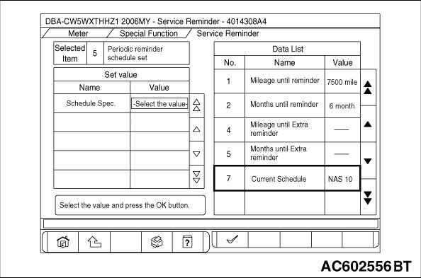 In addition to the operation of the scan tool MB991958, the schedule can be changed by operating the meter information switch on the combination meter. Refer to .