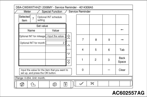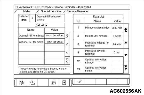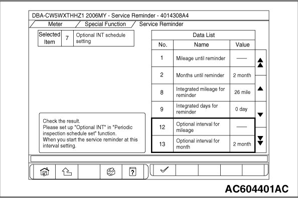 1. On the "Service Reminder" screen, select "7 Optional INT schedule setting."