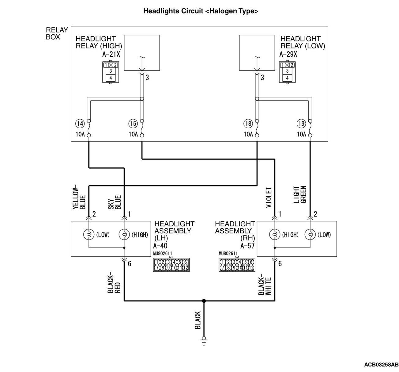 - Check the wiring harness between headlight assembly (RH) connector A-57 (terminal 2) and headlight relay (LOW) connector A-29X (terminal 3).[ RH-LOW]