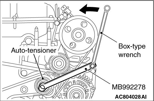 Be sure to set the box-type wrench and the special tool MB992278 to the hexagonal parts securely to prevent the tool from falling off because the tension of the auto-tensioner is high.