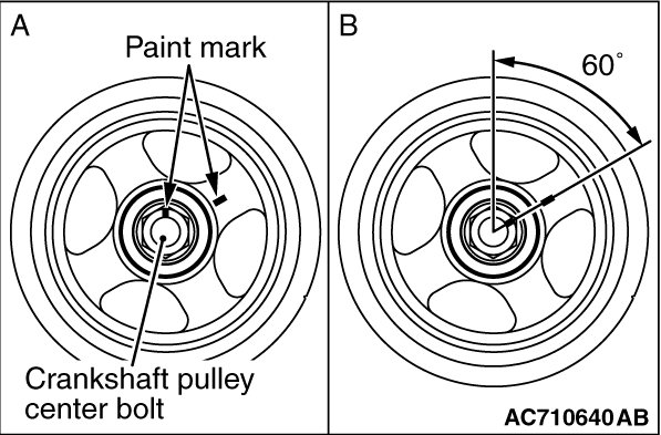 Tighten the crankshaft pulley center bolt by 60 degrees angle once more. Make sure the paint mark of crankshaft pulley center bolt is aligned with the paint mark of crankshaft pulley as shown in the illustration "B."