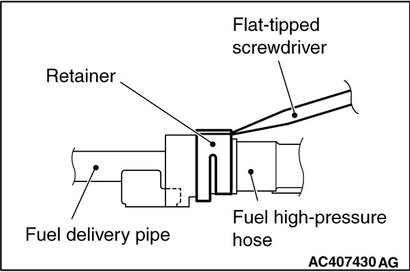 (1) Insert a flat-tipped screwdriver [6 mm (0.24 inch) wide and 1 mm (0.04inch) thick] into the retainer of the fuel high-pressure hose connector.