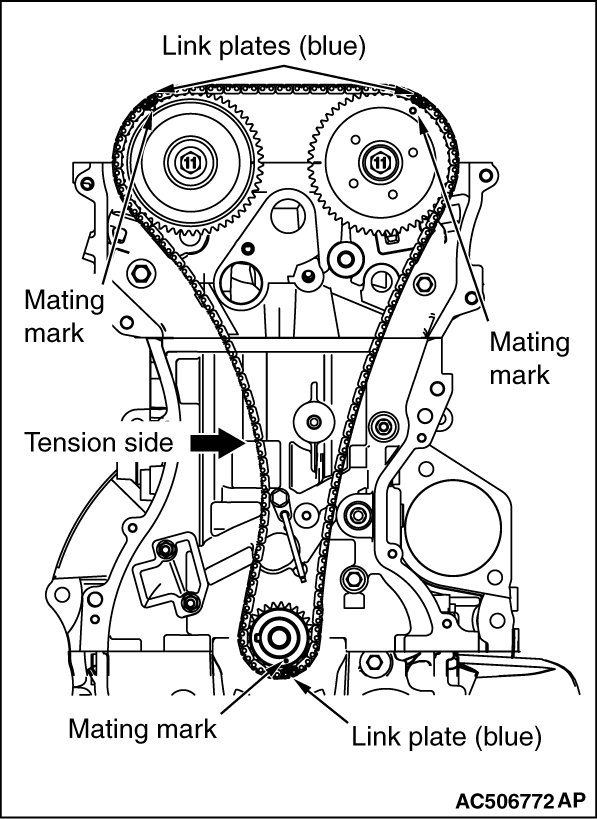 Align each sprocket timing chain mating mark with the link plate (blue) of timing chain to avoid slack of the timing chain tension side, and install the timing chain to the sprockets.
