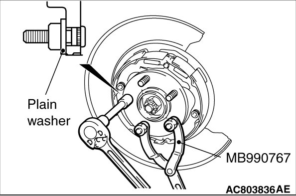 3. Install the plain washer to the new hub bolt, and install the bolt with a nut while holding the hub with special tool MB990767.