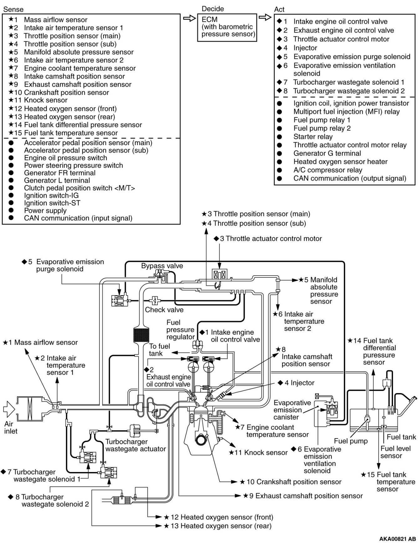 The Multiport Fuel Injection System consists of sensors which detect the engine conditions, the ENGINE CONTROL MODULE (ECM) which controls the system based on signals from these sensors, and actuators which operate under the control of the ECM.