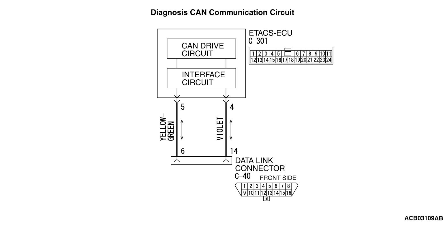- Malfunction of the wiring harness (open circuit, short to ground, short to power supply between the data link connector and the ETACS-ECU connector, line-to-line short, or power supply to the ETACS-ECU)