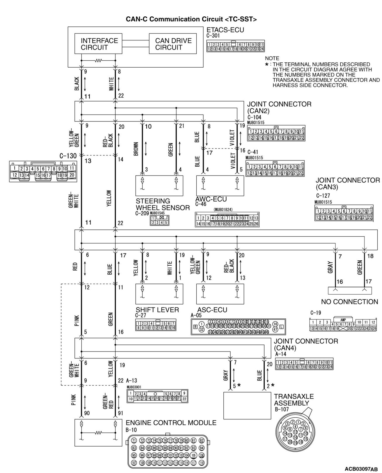 (2)Check the wiring harness between joint connector (CAN2) C-104 (terminal 11) and ETACS-ECU connector C-301 (terminal 9)