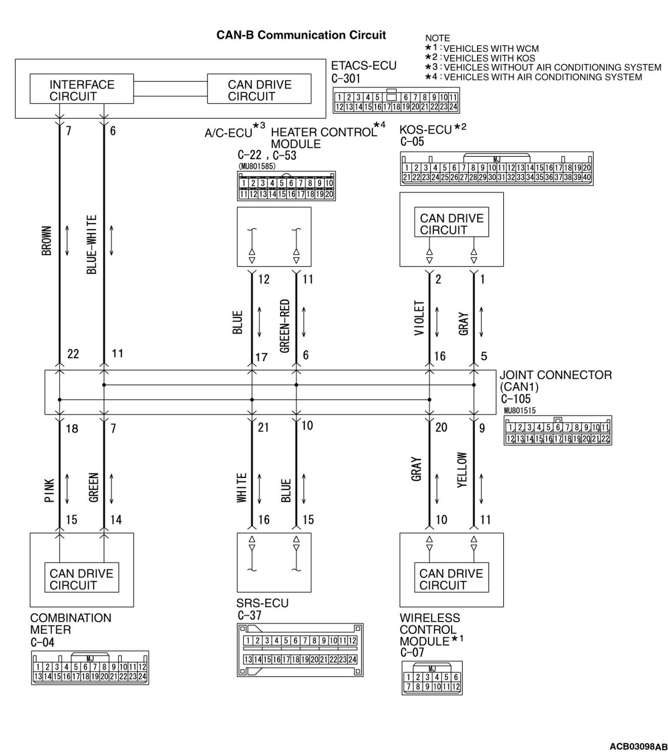 (2)Check the wiring harness between joint connector (CAN1) C-105 (terminal 10) and SRS-ECU connector C-37 (terminal 15)