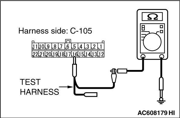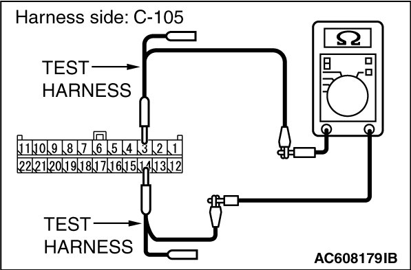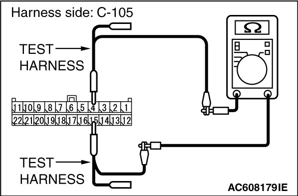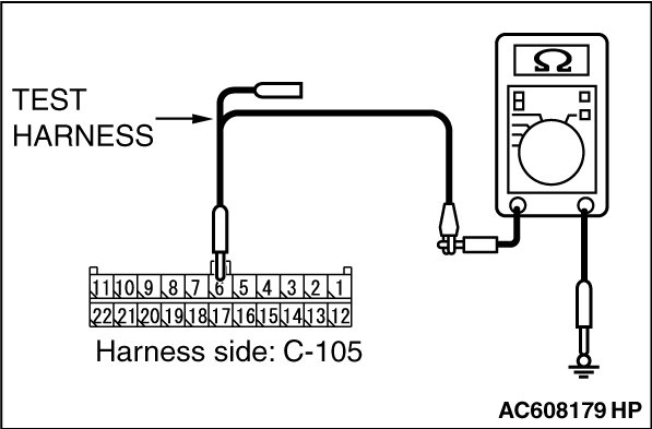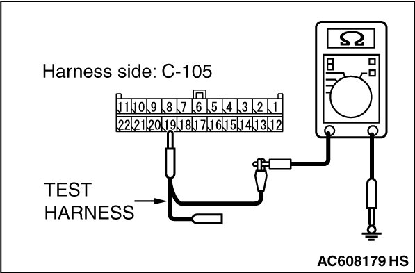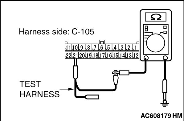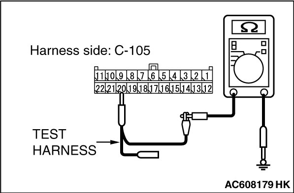 STEP 7. Check the wiring harness between joint connector (CAN1) C-105 and A/C-ECU connector C-22 [vehicles with A/C] or heater control unit connector C-53 [vehicles without A/C] for a short to ground. Measure the resistance at joint connector (CAN1) C-105.