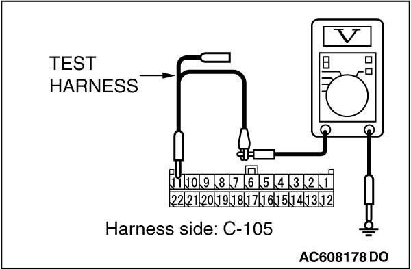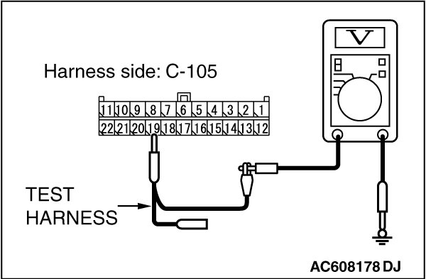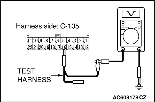 STEP 18. Check the wiring harness between joint connector (CAN1) C-105 and A/C-ECU connector C-22 [vehicles with A/C] or heater control unit connector C-53 [vehicles without A/C] for a short to power supply. Measure the voltage at joint connector (CAN1) C-105.