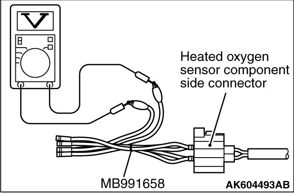 1. Disconnect the heated oxygen sensor connector and connect special tool MB991658 to the connector on the heated oxygen sensor side.