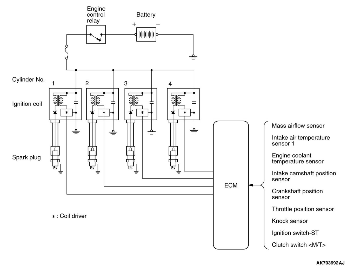 The ECM determines which ignition coil should be controlled by means of the signals from the camshaft position sensor and the crank angle sensor. It also detects the crankshaft position, in order to provide ignition at the most appropriate timing in response to the engine operation conditions.