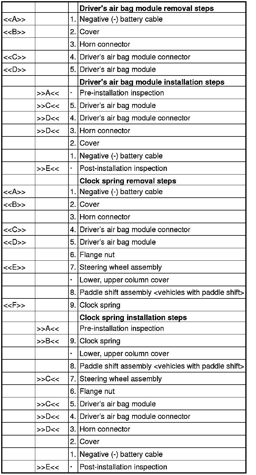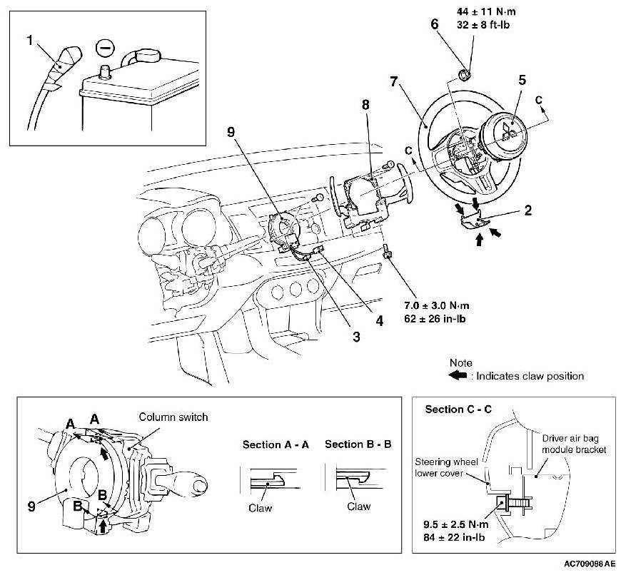 - Never attempt to disassemble or repair the air bag modules or clock spring. If faulty, replace it.