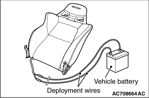 At a location as far away from the front seatback as possible, and from a shielded position, disconnect the two connected wires from each other, and connect them to the two terminals of the battery (which has been removed from the vehicle) to deploy the air bag.
