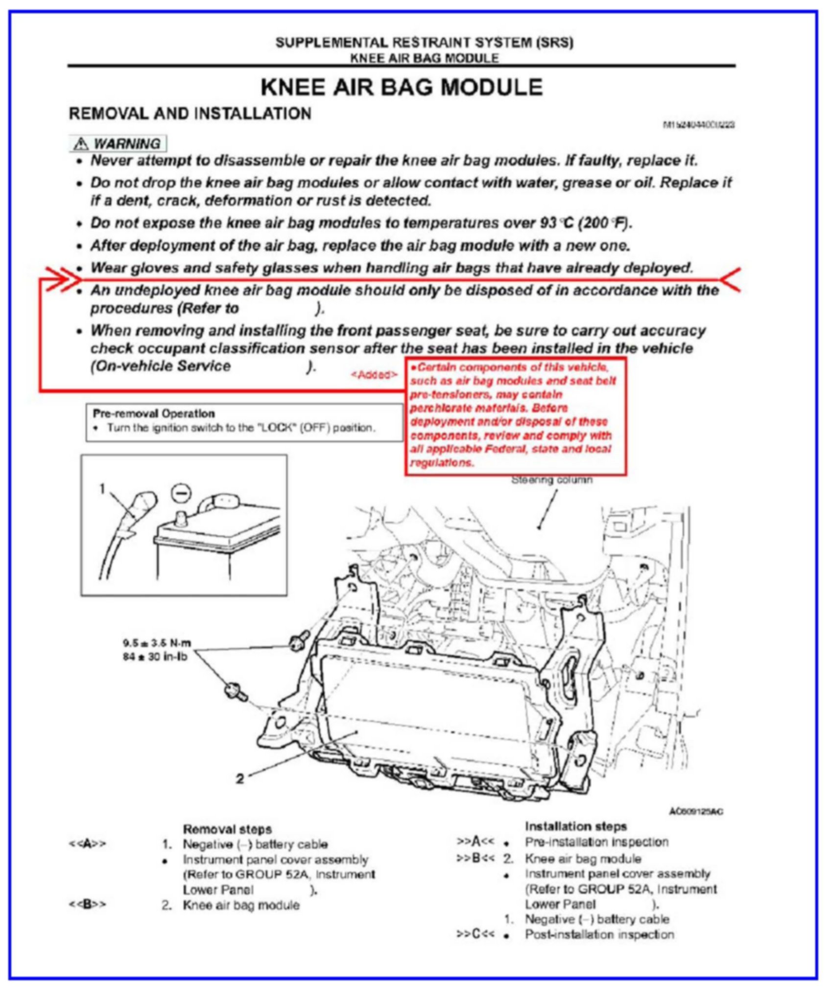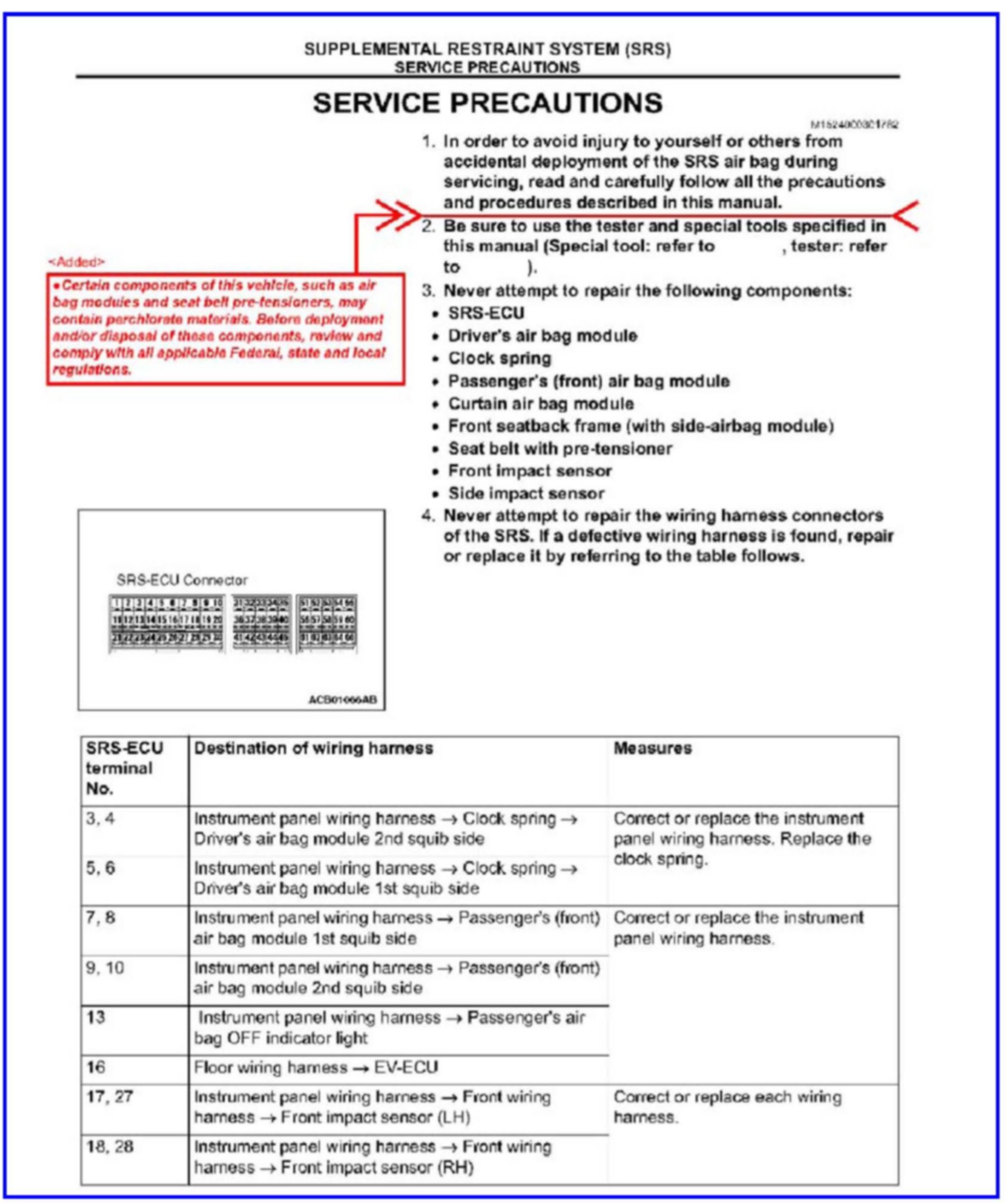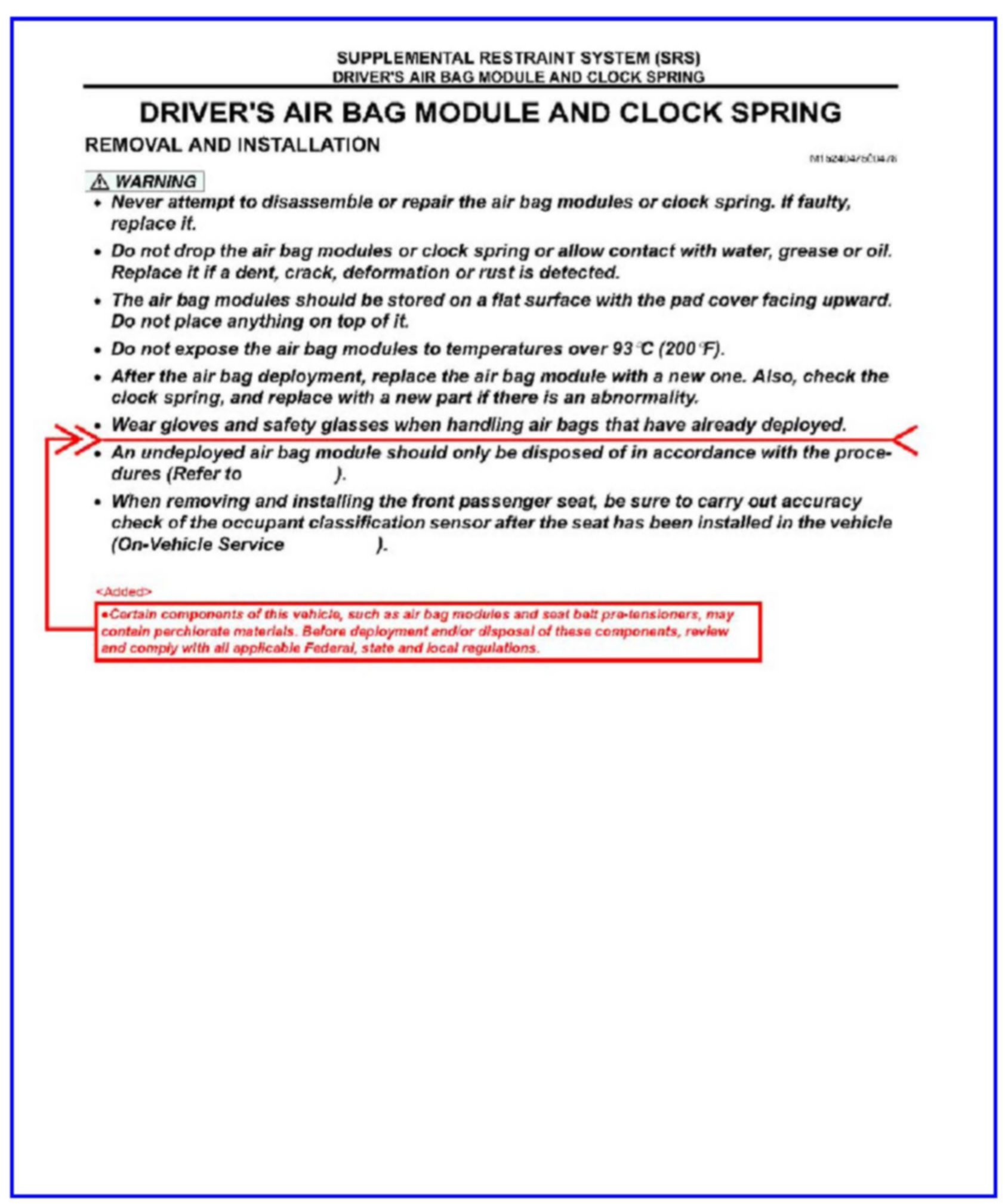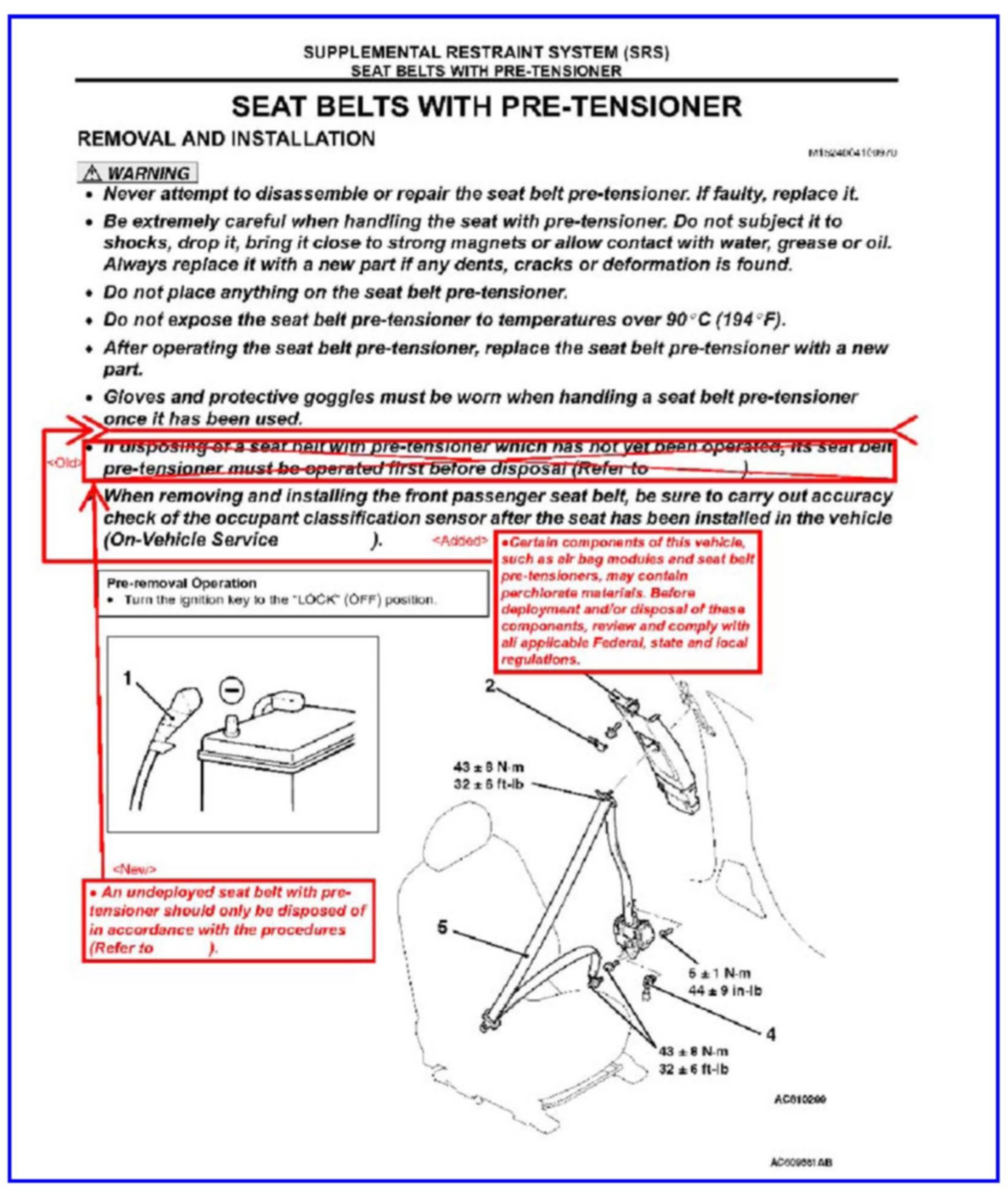 Caution statements regarding the disposal of certain SRS components have been incorrect in the service manuals of affected vehicles. This TSB provides updated caution statements.